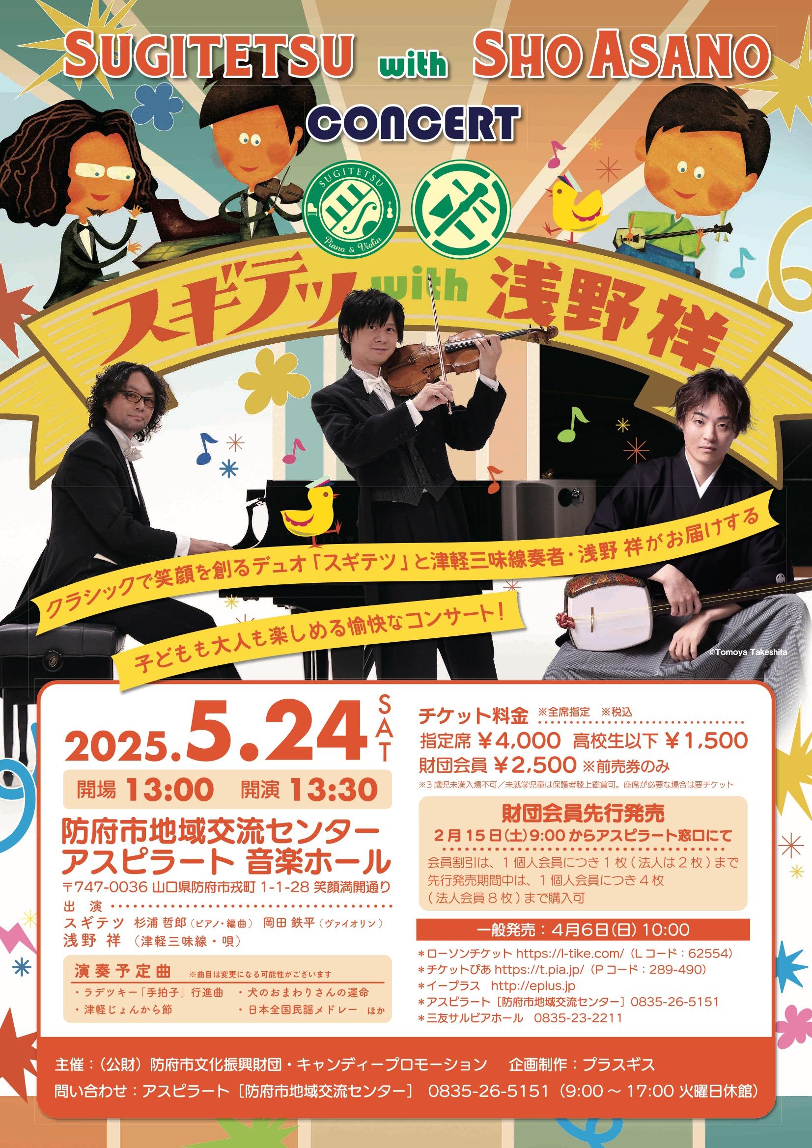 クラシックで笑顔を創るデュオ「スギテツ」と津軽三味線奏者 浅野祥がお届けする、子どもも大人も楽しめる愉快なコンサート!